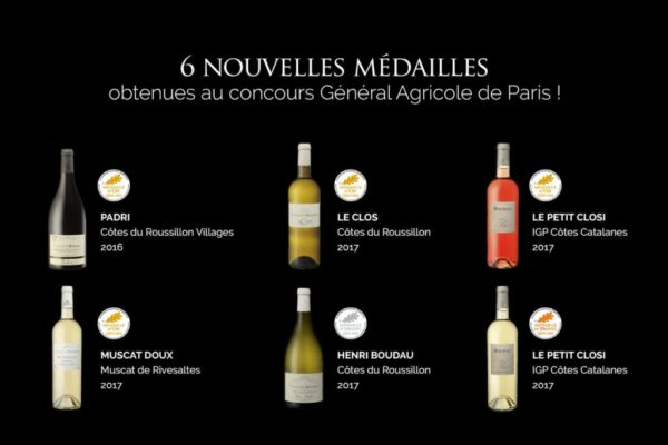 Encore largement récompensés, nos vins ont obtenu 6 médailles au Concours Général Agricole de Paris 2018.Le Petit Closi Rosé 2017,Padri 2016, Le Muscat de Rivesaltes 2017 et le Clos Blanc 2017 ont obtenu une médaille d’Or.